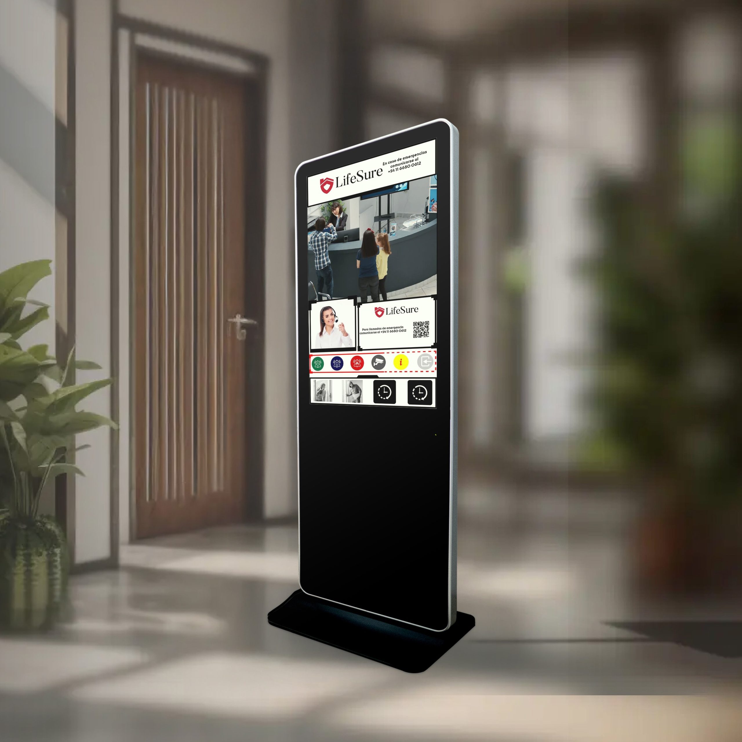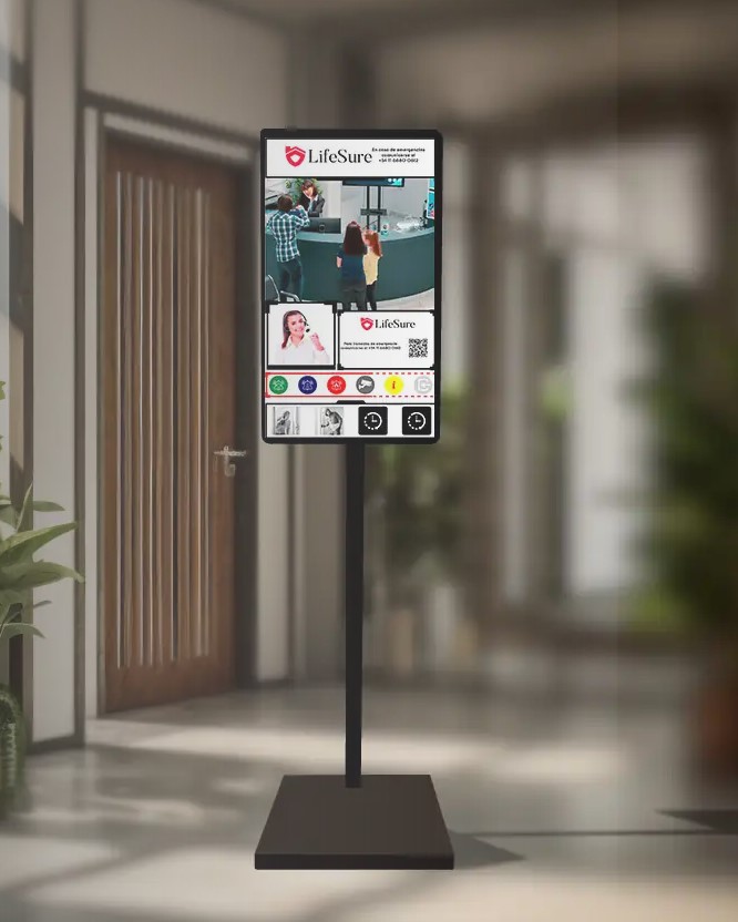 El marco tiene un acabado limpio y moderno, ideal para mantener la imagen de tu tótem o punto de atención.